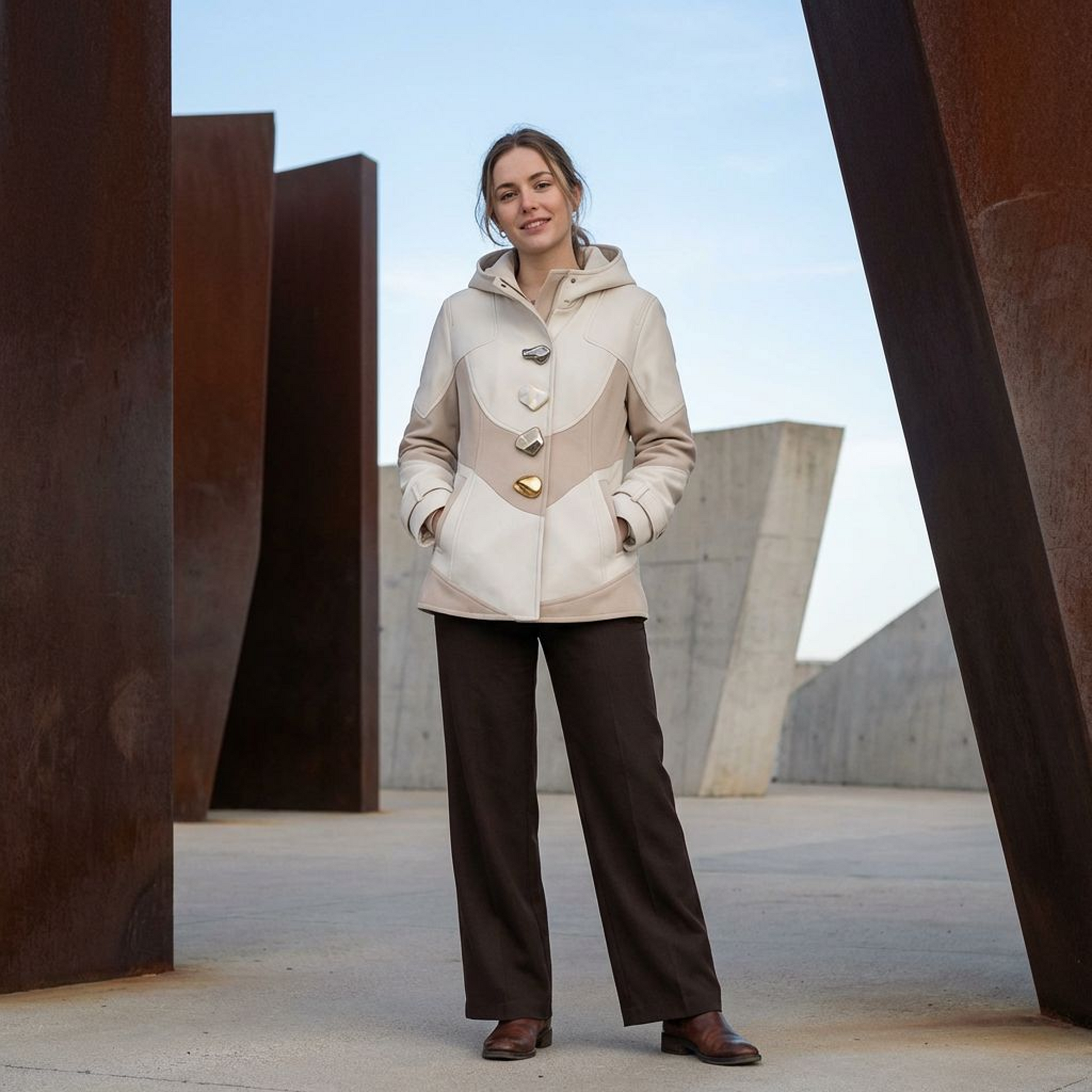 Chic and cozy with a modern edge, this hooded coat features a clean cream-and-taupe colorblock design with sculpted seam lines that flatter the shape. The standout mixed-metal statement buttons elevate the minimalist palette, while the structured hood and high neckline add extra coverage for cooler days. Finished with sleek vertical pockets and cuff tabs, it’s an easy outerwear piece for polished everyday outfits.